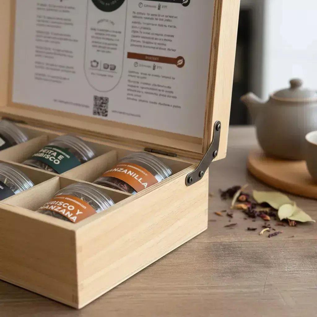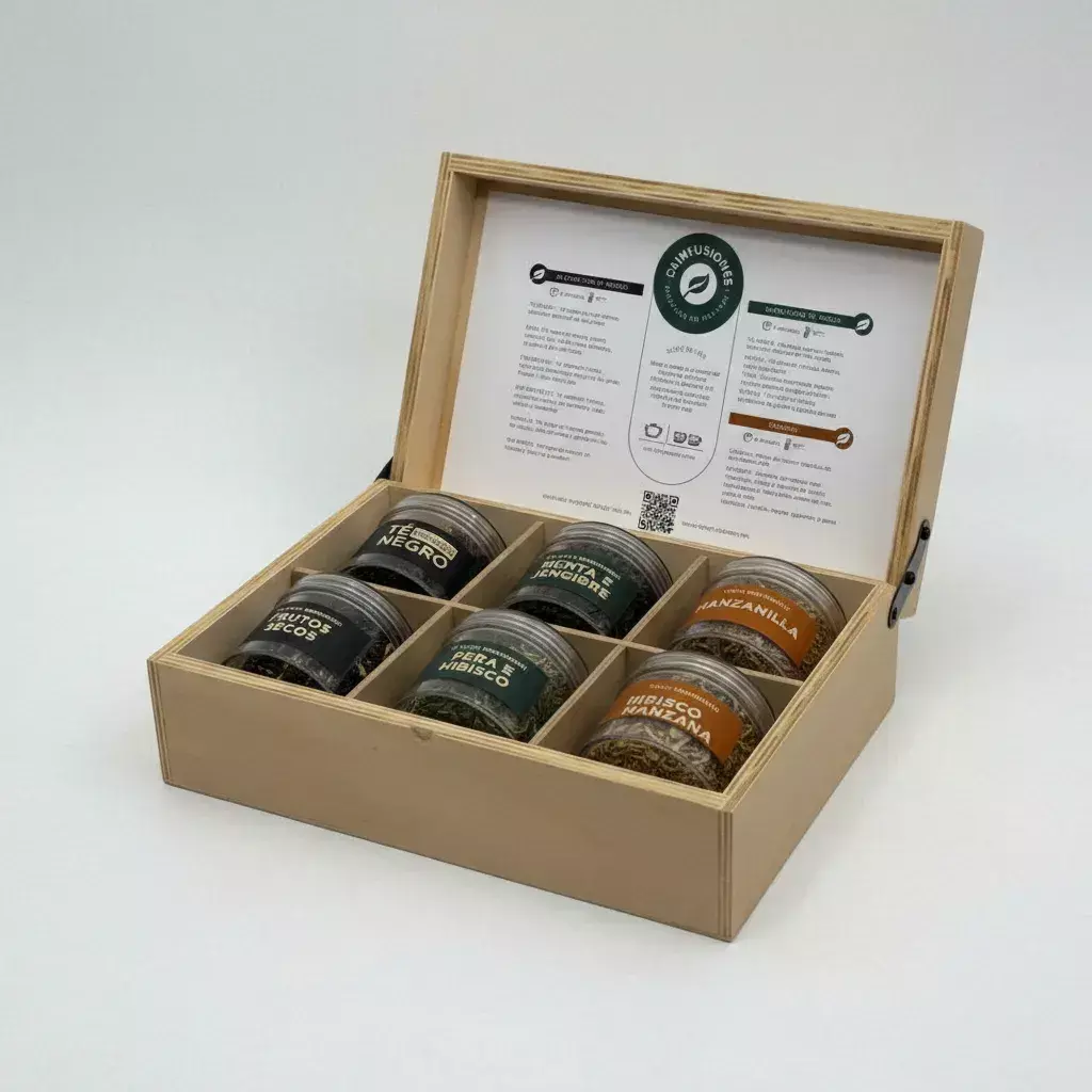 Caja de té de madera lustrada con bisagras metálicas y divisiones internas con 6 exquisitos blends de la línea DEINFUSIONES.